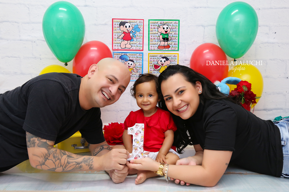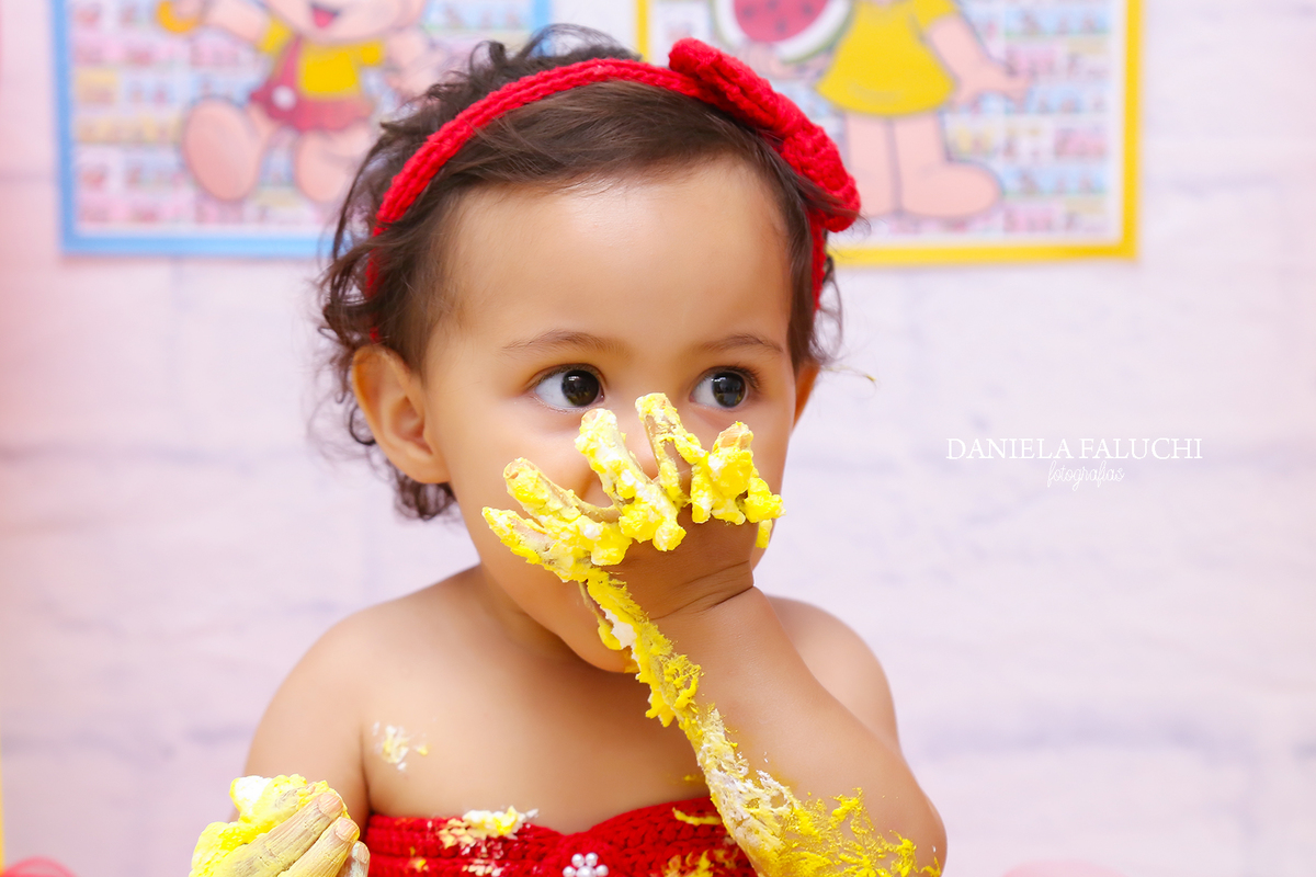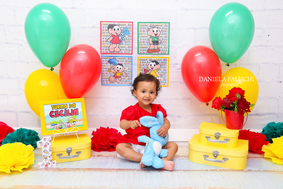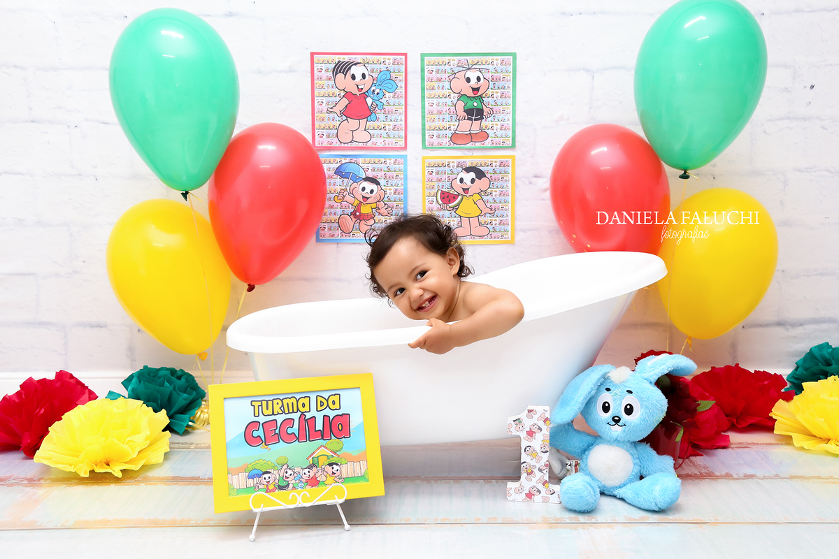 A linda Cecília finalizou seu Acompanhamento do bebê com um ensaio repleto de sorrisos com seu desenho preferido, smash the cake da Turma da Mônica.